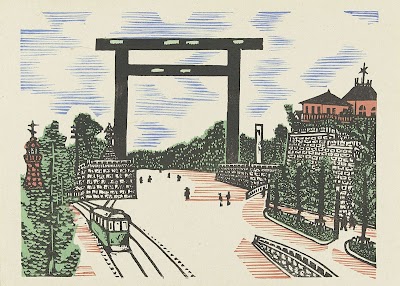 Drie krabben aan het water. De beweging van het water is aangegeven met zilverkleurige lijnen. Met twee gedichten, waarvan één door de acteur Ichikawa Danjûrô VII (Shichidaime Sanshô): We zijn naar het zilte nat geweest om de eerste zonsopgang te zien, maar mist kwam opzetten met de tred van een krab - het is onzeker of dit ook betekent dat het zijwaards gebeurde.