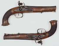 Het slot is gegraveerd met lofwerk; de slotplaat is van geelkoper en voorzien van een signatuur; het vuurstaal is in reliëf gebeiteld. De loop is gegraveerd met bladerranken en heeft op vier plaatsen een ring; het voorste gedeelte kan worden afgeschroefd bij de rand na de tweede ring en is getrokken met 7 groeven; de tromp is tulpvormig als bij een kanon. De halve voorlade is in reliëf gesneden met onder meer een acanthusblad achter de loop. Het gegoten, geelkoperen beslag met nageciseleerde reliëfversiering is verguld en bestaat onder andere uit een ajour bewerkte schroefplaat met lof- en bandwerk rond twee griffioenen aan weerszijden van een schild met een mannenbuste erop, een gekroonde duimplaat met het portret van een man in toga omlijst door ajour bewerkt lofwerk en onderaan een masker, en een kolfkap met aan beide zijden een zittende Klassieke figuur en lofwerk, en onderop een grotesk masker omlijst door acanthusbladeren; geen voorziening voor een laadstok.