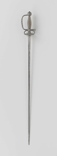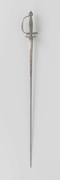 Het gevest is versierd met hermen, ruiters, lofwerk en maskers; de greep is omwonden met gedraaid ijzerdraad en heeft aan weerskanten gevlochten greepringen; de pareerstang heeft de vorm van op hun rug liggende hermen met allongepruiken in hoogreliëf; de stootplaat is gedeeltelijk ajour bewerkt in reliëf met ruiters op stijgerende paarden tussen twee stadspoorten of kerken in en in elke hoek een man met allongepruik; de kling heeft een hol-ruitvormige doorsnede.