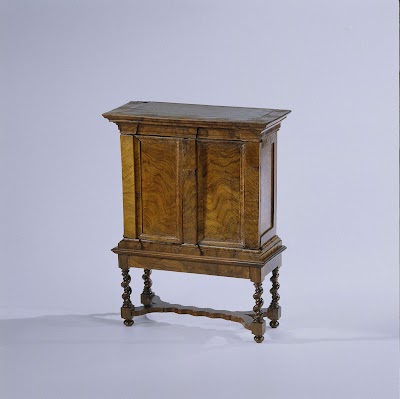 Rechthoekige kist - donker hout - versierd met gouden boompjes met ingelegde parelmoeren blaadjes tussen gouden en donkerkleurige blaadjes. Daaromheen motiefjes in goud tussen twee parelmoeren banden; buitenrand drie blokbanden met alternerend parelmoer. Dit patroon op alle zijden behalve de bodem. Klapdeksel is de voorkant. Twee hengsels aan de zijden en slot en beslag aan het klapdeksel. Zeven laden en middenvakje achter klapdeksel.
