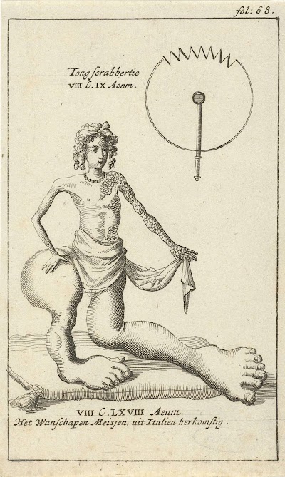 Een menselijk skelet met een gebogen rug, van achteren gezien, in een landschap. Rechtsonder een antieke vaas waarop een opschrift in het Latijn.