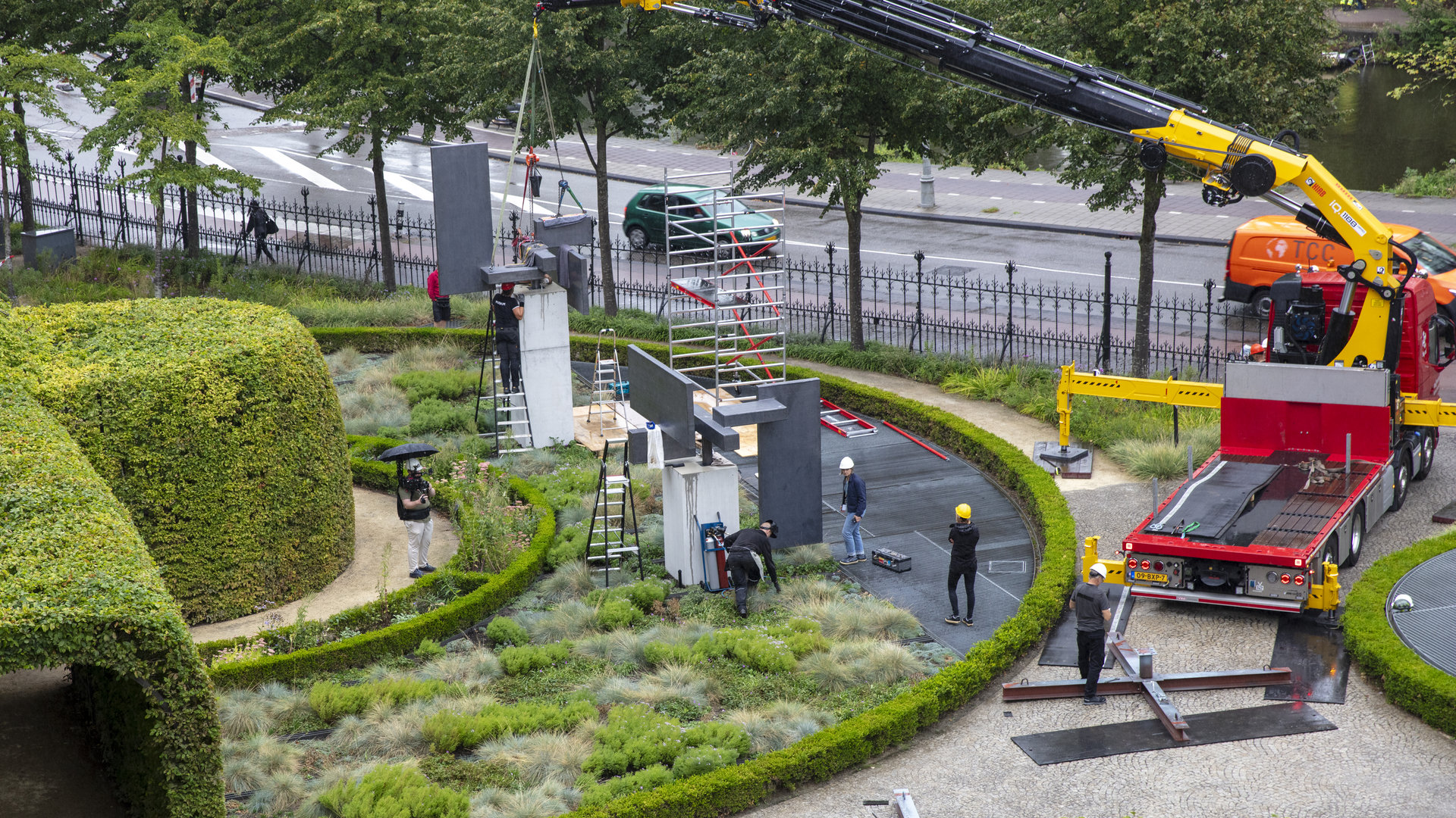 Omdat ze zo groot zijn worden ze op een dieplader naar het Rijksmuseum gebracht. Anders kunnen ze niet onder de bovenleiding van de tram door. Een kraan zet de beelden van bijna 2000 kilo per stuk precies zo neer als in 1964 voor het kantoorgebouw in Den Haag.